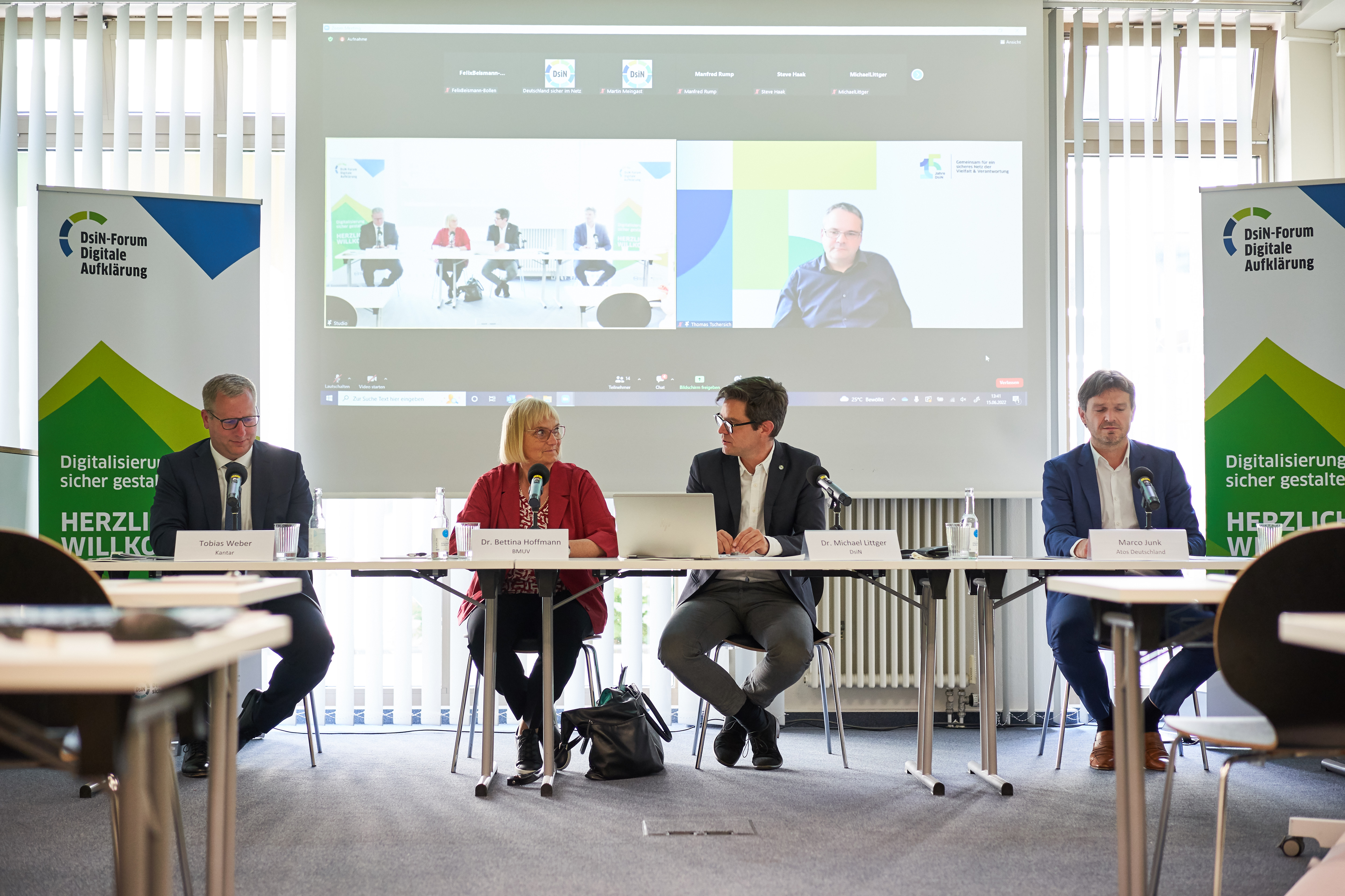 Der DsiN-Sicherheitsindex 2022 erschien am 15.06.2022. Zur Veröffentlichung begrüßten wir im DsiN-Forum die parlamentarische Staatssekretärin Dr. Bettina Hoffmann (BMUV). Außerdem hießen wir Marco Junk (Atos Deutschland) als Studienpartner und Tobias Weber (Kantar) willkommen. Darüber hinaus nahm Thomas Tschersich