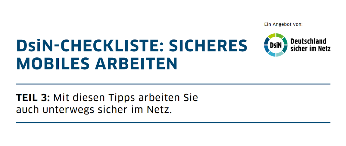 Viele Arbeitnehmende und Selbstständige arbeiten mittlerweile nicht nur im Büro, sondern auch mobil, z. B. im Zug oder auch während der Urlaubszeit, wenn es sich nicht vermeiden lässt. Die DsiN-Checkliste zum sicheren mobilen Arbeiten bietet praktische Tipps für mehr IT-Sicherheit unterwegs.