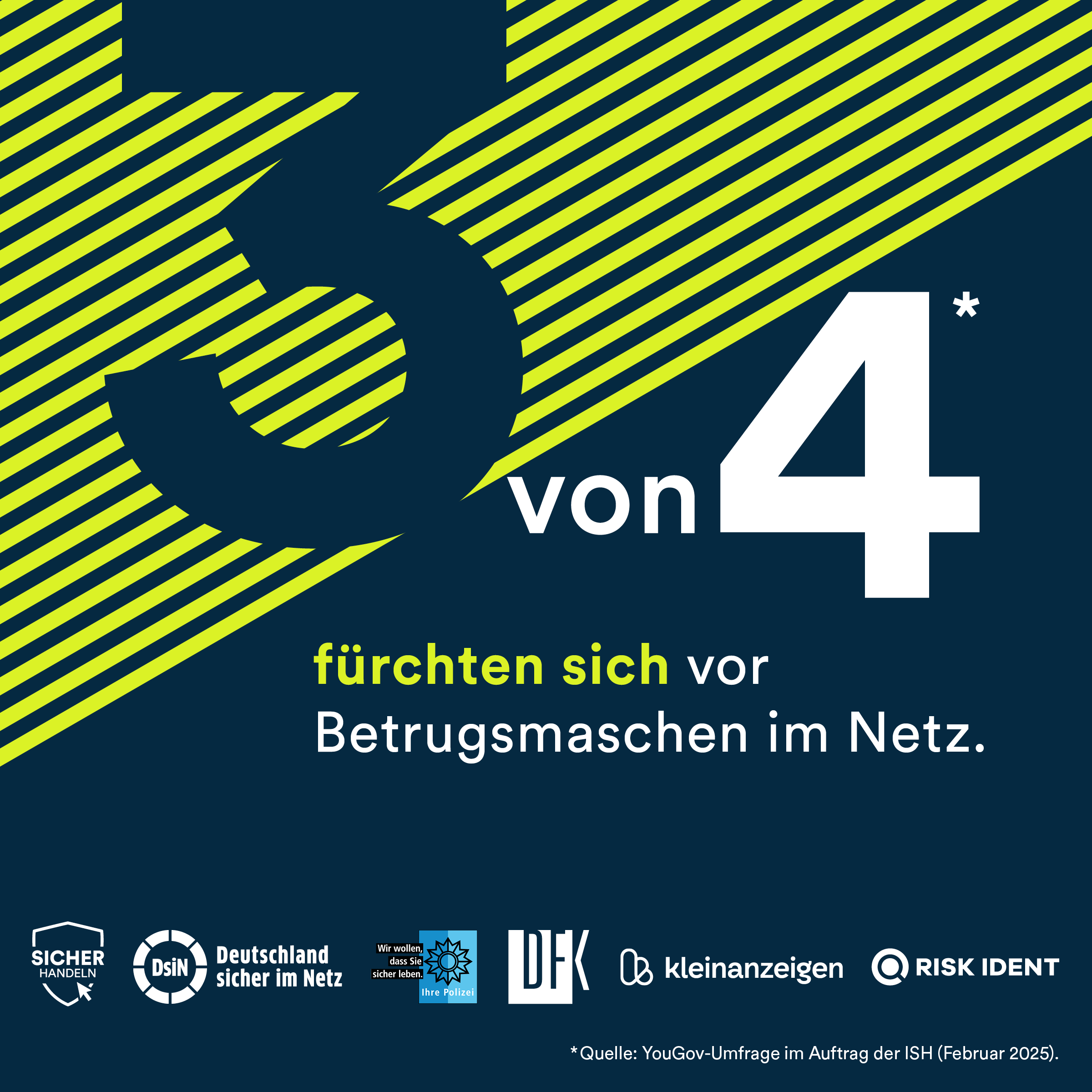 Die Gefahr, Opfer eines Internetbetrugs zu werden, steigt. Das hat auch der Verein Deutschland sicher im Netz e. V. (DsiN) herausgefunden, der neben der Polizeilichen Kriminalprävention der Länder und des Bundes (ProPK), der Stiftung Deutsches Forum für Kriminalprävention (DFK), RISK IDENT und Kleinanzeigen zur ISH gehört.