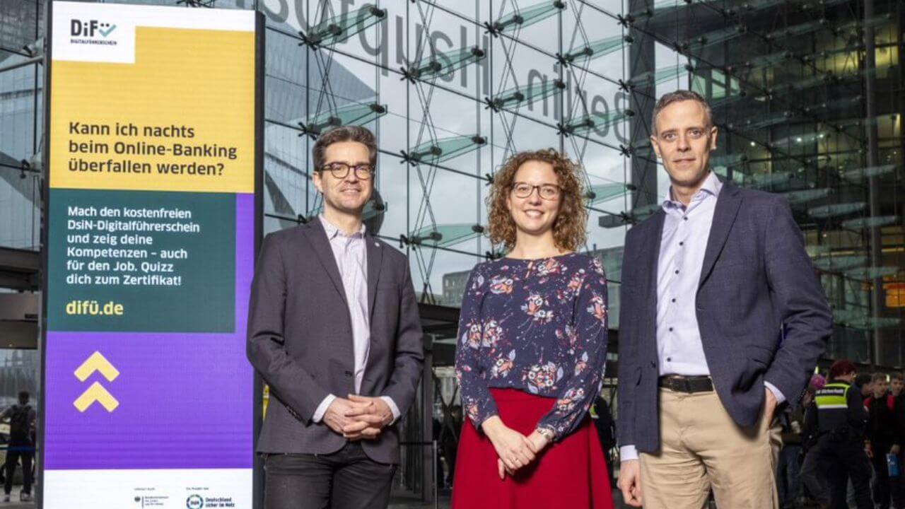 „Der DsiN-Digitalführerschein ist ein wichtiger Baustein, um Digitalkompetenzen für Teilhabe und Cyber-Resilienz in der Bevölkerung konkret zu stärken“, erklärte Dr. Markus Richter, Staatssekretär im Bundesministerium des Innern und für Heimat und CIO des Bundes. „Die bundesweite Plakatkampagne trägt dazu bei, mehr Menschen auf das kostenfreie Angebot aufmerksam zu machen und auch Menschen im Berufsleben von den Vorteilen eines Digitalzertifikats zu überzeugen.“ Mit dem DiFü können die eigenen Digitalkompetenzen selbständig überprüft und in einer Urkunde zertifiziert werden. Mit der Aufforderung „Quizz dich zum Zertifikat“ greift die Kampagne den spielerischen Lernansatz des Digitalführerscheins auf, mit dem Teilnehmende ihre Digitalkompetenzen in sechs verschiedenen Modulen erweitern können „Die Kampagne holt die Menschen bei ihren Herausforderungen im Internet ab. Onlinebanking spielt dabei heute eine maßgebliche Rolle und ist daher ein Schwerpunkt der aktuellen Kampagne“, erklärt DsiN-Geschäftsführer Dr. Michael Littger. Laut einer Bitkom-Umfrage nutzen aktuell fast vier von fünf Erwachsenen Menschen in Deutschland Onlinebanking. „Wer beim DiFü mitmacht, hat schon halb gewonnen. Denn für eine sichere Nutzung des Internets und digitaler Dienste braucht es grundlegende Fertigkeiten, die aktuell gehalten werden“, so Littger.