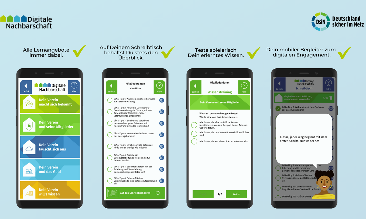 Die Lern-App der Digitalen Nachbarschaft setzt genau hier an. Immer griffbereit lassen sich die verschiedenen Themenwelten auf dem Smartphone oder Tablet durchstöbern. Mithilfe eines integrierten Schreibtischs werden Lern-Module strukturiert und Fortschritte festgehalten. Ein Wissenstraining bietet die Chance, das Gelernte regelmäßig zu testen und sogar zertifizieren zu lassen: mit dem DiNa-Check erhält der Nutzer die Auszeichnung für erfolgreiche Sicherheitsvorkehrungen im Verein und kann sich selbst als DiNa-Scout zertifizieren lassen.
