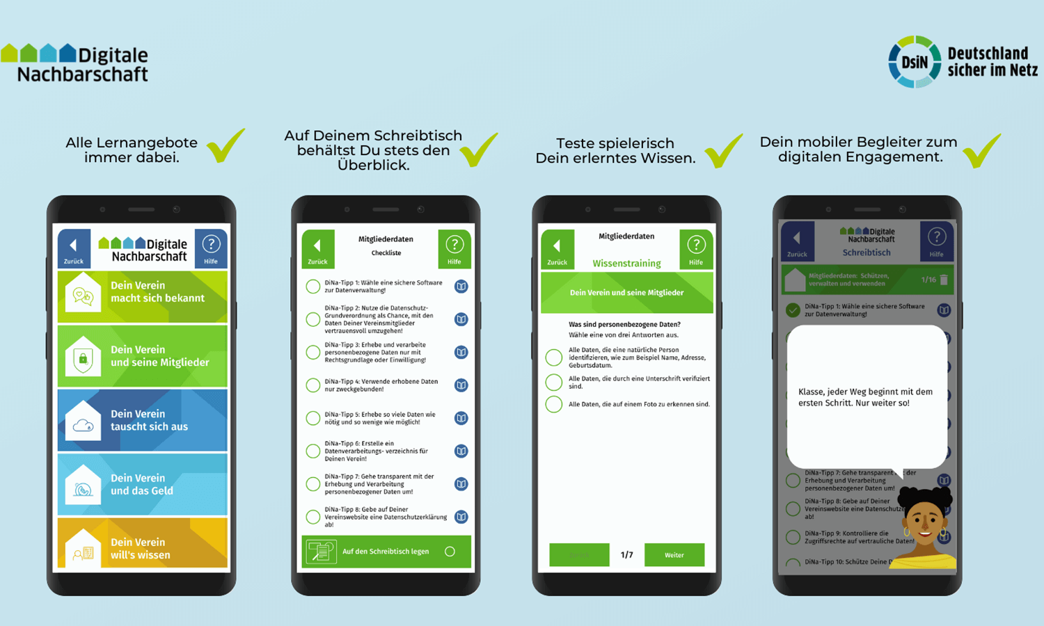 Die Lern-App der Digitalen Nachbarschaft setzt genau hier an. Immer griffbereit lassen sich die verschiedenen Themenwelten auf dem Smartphone oder Tablet durchstöbern. Mithilfe eines integrierten Schreibtischs werden Lern-Module strukturiert und Fortschritte festgehalten. Ein Wissenstraining bietet die Chance, das Gelernte regelmäßig zu testen und sogar zertifizieren zu lassen: mit dem DiNa-Check erhält der Nutzer die Auszeichnung für erfolgreiche Sicherheitsvorkehrungen im Verein und kann sich selbst als DiNa-Scout zertifizieren lassen.