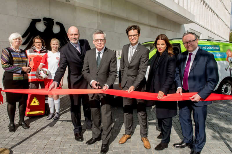 Unter dem Motto „Du und Dein Verein – sicher im Netz“ geht das DsiN-Projekt Digitale Nachbarschaft (DiNa) mit dem DiNaMobil ab Mai auf Deutschlandtour und schult Vereine vor Ort zu IT- und Internetsicherheit. Bundesinnenminister und Schirmherr von Deutschland sicher im Netz e.V. Dr. Thomas de Maizière hat in Berlin den offiziellen Startschuss für die Roadshow gegeben.