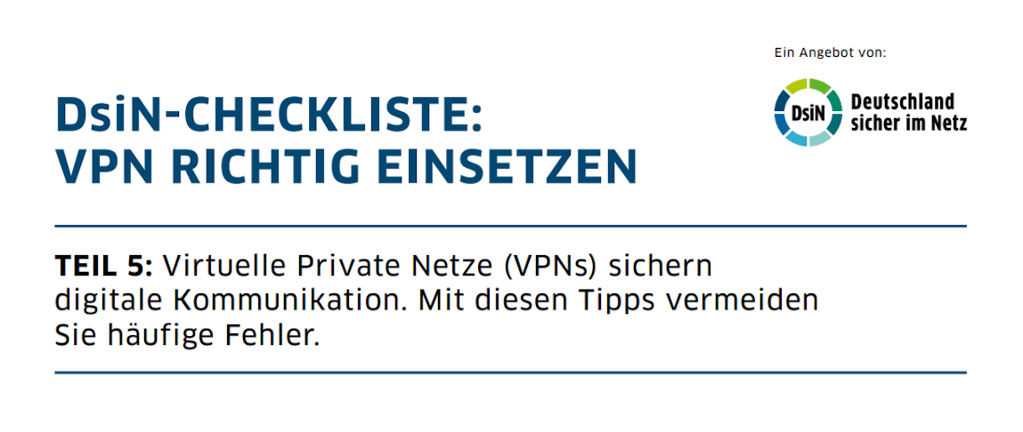 Über ein VPN-Netzwerk können Sie außerhalb Ihrer festen Büro-/ bzw. Arbeitsumgebung auf das entsprechende Netzwerk zugreifen und damit arbeiten. Eine VPN-Verbindung basiert auf einer Software. Mit der DsiN-Checkliste vermeiden Sie häufige Fehler und nutzen die Anwendung sicher. Hier finden Sie alle DsiN-Checklisten für sicheres digitales Arbeiten in der Übersicht.